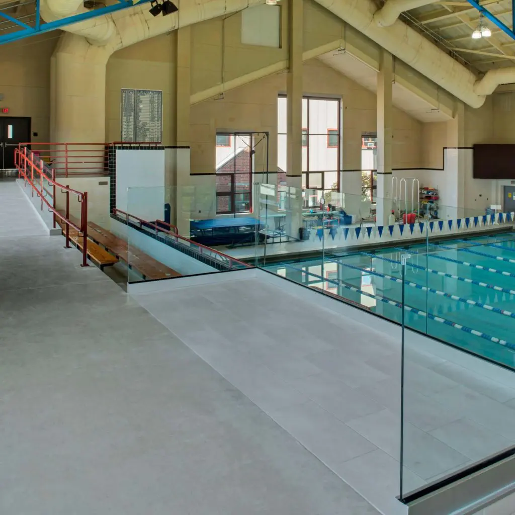 The college’s Keohane Pool was built in the 1980s, before the Americans with Disabilities Act of 1990 (ADA) began requiring new facilities to meet accessibility standards. Very much an artifact of its era, the building features clerestory lights illuminating the large interior volume, which is given shape by strong geometric forms adorned with painted metal rails and glossy ceramic tile. The mezzanine was already served by an elevator, but the bleachers were down several steps from the elevator landing and lacked wheelchair seating.